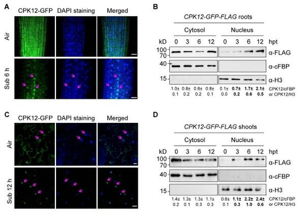 图1. 低氧诱导磷酸化的CPK12由细胞质向细胞核转移。