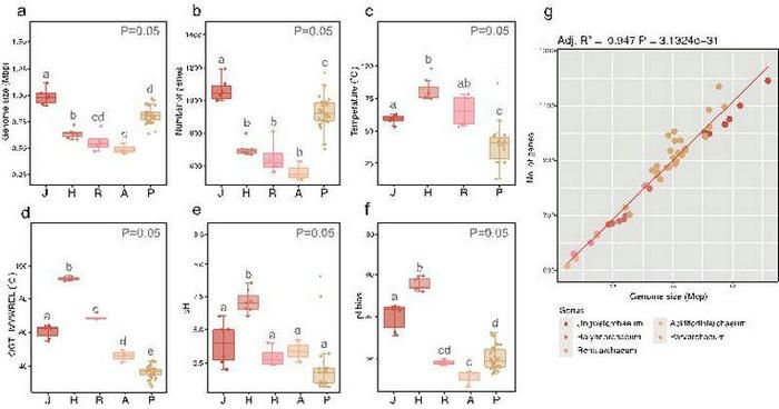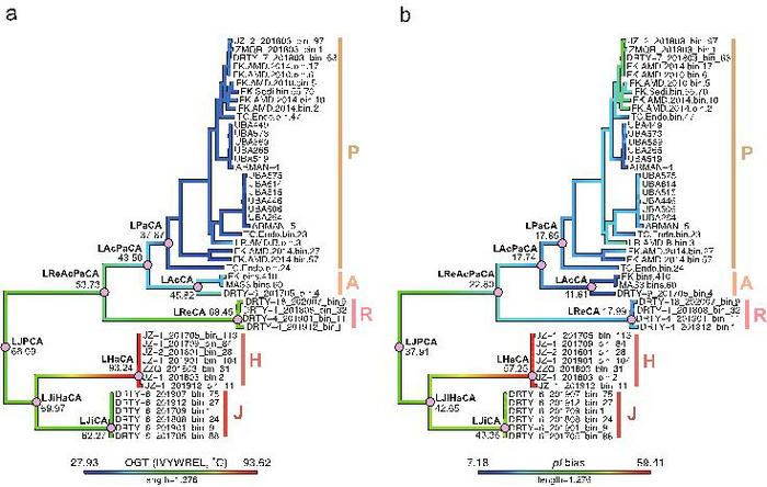 精卫古菌目与早期发现的DPANN古菌——ARMAN古菌中的Parvarchaeales 形成姊妹支系(图一)。通过代谢潜能分析发现,前者具有典型的DPANN古菌“回收型“的代谢方式,即利用外部环境或宿主“现成”的核苷酸和氨基酸等小分子合成自身大分子并产生能量。而Parvarchaeales则具有更加多样的代谢能力,可能通过糖酵解、三羧酸循环和电子传递链多种方式产能(图二)。通过比较基因组学分析,以及最适生长温度、最适生长温度pH(pI)等“逆向生态学”分析表明,精卫古菌目中的新属海燕古菌属是一种超嗜热菌,其最适生长温度(OGT)超过80˚C。它们通过编码超嗜热菌特异性基因反向螺旋酶(rgy),以及基因组和所编码蛋白组的本身特征,例如基因组精简化、高编码密度、高重叠基因比例和高温特异性的基酸组成偏好性来适应极端高温环境(图三)。而对于嗜酸类群,包括精卫古菌属和Parvarchaeales 支系,则具有由水平基因转移主导获得的差异化的酸适应性机制。分别通过特定基因形成难以通透质子的细胞膜,和外排质子以维持细胞内部环境稳定。进一步的进化历史重构表明,这些古菌支系具有共同的热起源,在后续进化中,海燕古菌属逐步适应更高温的生境,成为超嗜热菌,而Parvarchaeales支系则逐渐适应低温环境。另外,祖先节点具有近中性的等电位点(pI),表明共同祖先适应中性环境生存,而对酸性环境的适应性可能为后续通过水平基因转移主导的进化所产生(图四)。
