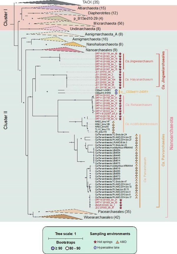 该研究揭示DPANN古菌对高温以及酸性极端环境的适应性机制,并对其相关祖先性状进行了重构。研究成果以Metagenomic Discovery of “Candidatus Parvarchaeales”-Related Lineages Sheds Light on Adaptation and Diversification from Neutral-Thermal to Acidic-Mesothermal Environments为题发表于学术期刊mSystems。bat365在线中国登录入口为该成果的第一完成单位。本论文得到国家自然科学基金的支持。