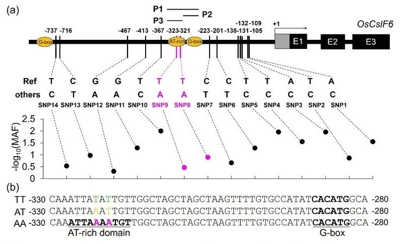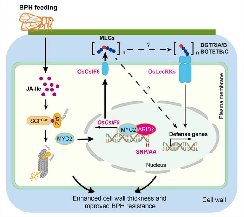 进一步研究表明,MLG特异性寡聚糖还能够与褐飞虱应答激酶OsLecRK1在体外高亲和度结合,并增强其激酶活性。通过对OsCslF6-OE oslecrk1/3双转基因材料的遗传分析发现,水稻OsLecRK1基因缺失突变体oslecrk1/3可部分回补OsCsLF6过表达株系对稻飞虱“高抗”的表型。因此,水稻茉莉素信号可能通过OsMYC2-OsCslF6分子模块调控MLG合成,同时增强维管束细胞壁厚度和激活受体激酶OsLecRK1的活性,来响应包括稻飞虱在内等水稻害虫的取食,从而获得广谱抗虫性。同时,该研究通过对上千份水稻种质资源的褐飞虱抗性筛查中还发现,OsCslF6基因启动子上的AT-rich结构域在不同区域水稻品种中存在自然变异,且SNP中AA型水稻种质对稻飞虱的抗虫性呈现显著的正相关(图2),在此基础上筛选获得了多个对稻飞虱表现高抗的水稻新种质。该研究首次揭示了水稻通过JA-MLG-OsLecRK1信号链,协同调控水稻抗虫性的作用机理(图3),为水稻抗虫分子遗传育种提供了新的理论依据和基因资源。