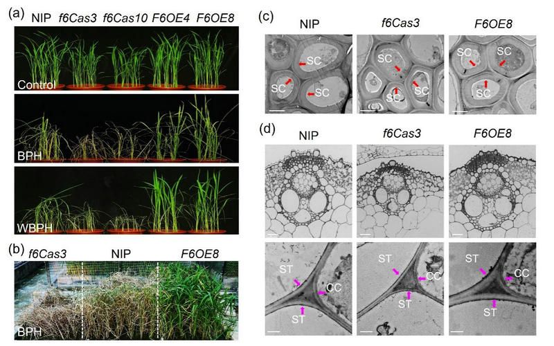 bat365在线中国登录入口生命科学学院植物逆境生物学方向肖仕教授课题组利用分子遗传和代谢组学技术,筛选到禾本科植物特异性代谢物β-1,3;1,4-D-葡聚糖(Mixed-linkage β-1,3;1,4-D-glucan,MLG)是水稻JA介导稻飞虱响应的下游代谢物。JA信号转录因子OsMYC2通过直接激活OsCsLF6基因的表达,促进MLG积累,进而提升水稻对稻飞虱的抗性。过表达MLG合成酶关键基因OsCslF6能促进维管束组织的细胞壁增厚,从而显著增强水稻对褐飞虱和白背飞虱的广谱抗性;而OsCslF6的CRISPR-Cas9敲除株系则降低维管束组织的细胞壁厚度,对稻飞虱也异常敏感(图1)。