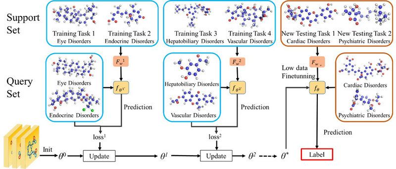 图1. 在小样本药物发现场景下用于分子特性预测的元学习框架。蓝色框和橙色框分别代表训练阶段和测试阶段的数据流。