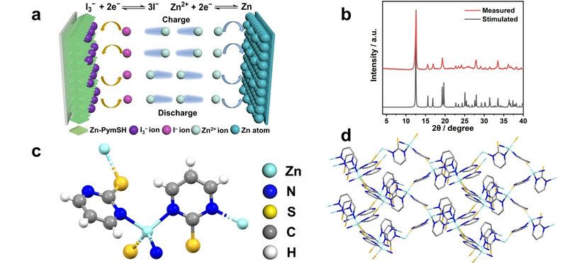 图 6.(a)Zn−I DIB 机制的示意图。(b)Zn-PymSH 的 XRD 图。(c)Zn-PymSH 中锌原子的配位层。(d)Zn-PymSH 的 3D 网络结构。