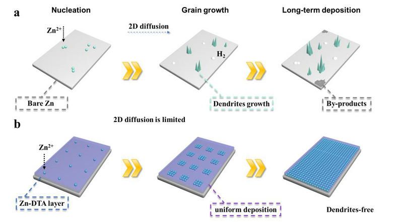 图 8. 锌离子在阳极表面的沉积行为示意图:(a)锌在裸锌阳极上的不均匀沉积导致大量聚集枝晶,伴随副产物和副反应产生的气体。(b)Zn-DTA@Zn阳极具有优良的锌沉积行为调节能力,使得到的阳极表面均匀。