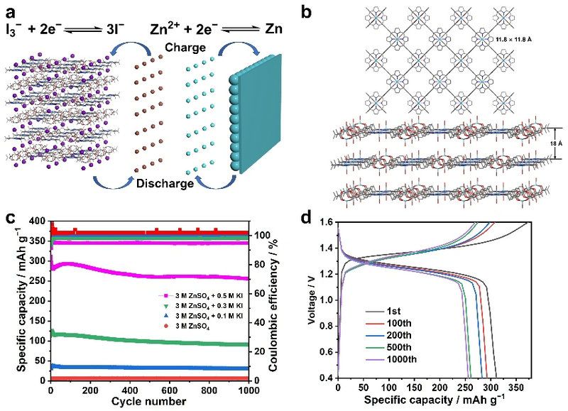 图 1. (a)Zn-I DIB 示意图。(b)Zn-TCPP 的晶体结构。(c)Zn-TCPP 在 5 A g−1 下使用不同电解质的循环性能。(d)Zn-TCPP 的 XRD 图谱。