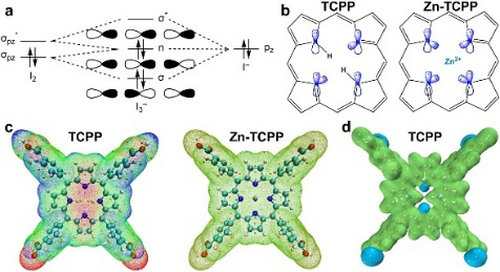 图 2. (a)I3− 的分子轨道图。(b)TCPP 和 Zn-TCPP 的卟啉氮分子轨道结构。(c)TCPP 和 Zn-TCPP 的 EDESP 等值面图。(d)TCPP 的 ESP 等值面图。