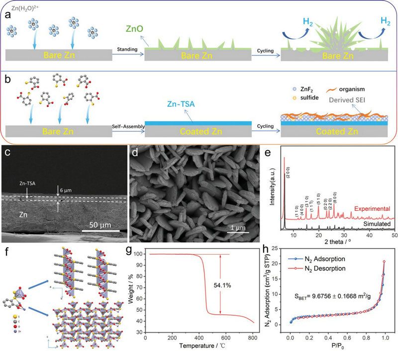 图 4.(a)裸锌表面的锌枝晶生长机制示意图。(b)Zn-TSA@Zn负极上的SEI形成机制。(c)Zn-TSA@Zn电极的横截面和(d)表面SEM图像。(e)Zn-TSA 的 XRD 图。(f)Zn-TSA 结构的多面体描述,展示了TSA中单个Zn(II)三角双锥片的分离程度。(g)TG曲线和(h)Zn-TSA的氮吸附/脱附等温线图。