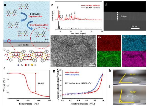 图 9.(a)Zn-DTA层原位合成工艺示意图。(b)Zn-DTA结构示意图。(c)Zn-DTA的XRD图谱(参考图谱和实际产物图谱)。(d)原始Zn-DTA阳极截面SEM图像。(e)Zn-DTA@Zn电极的SEM图像和能量色散光谱(EDS)映射,显示了C、O、S和Zn的元素分布。(f)上述Zn-DTA粉末的热重(TGA)曲线。(g)Zn-DTA粉末的吸附/解吸曲线。去离子水在(h)Zn-DTA@Zn和(i)裸锌电极上的接触角测量。