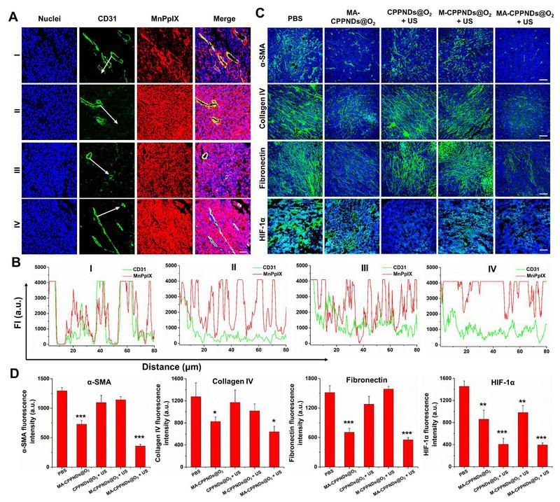 图 超声响应聚合物PFH纳米液滴用于PDAC的声动力治疗。(A)超声刺激或ECM重塑后,药物在肿瘤组织中的渗透。I:未处理组;II:超声处理组;III:ECM重塑组;IV:超声刺激加ECM重塑组。(B)MnPpIX荧光强度与CD31标记的肿瘤血管距离的定量分析。(C)纳米药物治疗后PDAC肿瘤组织中ECM调节情况和乏氧缓解情况。(D)治疗后对的肿瘤组织中α-SMA、IV型胶原、纤维连接蛋白和HIF-1α的荧光强度的半定量分析。