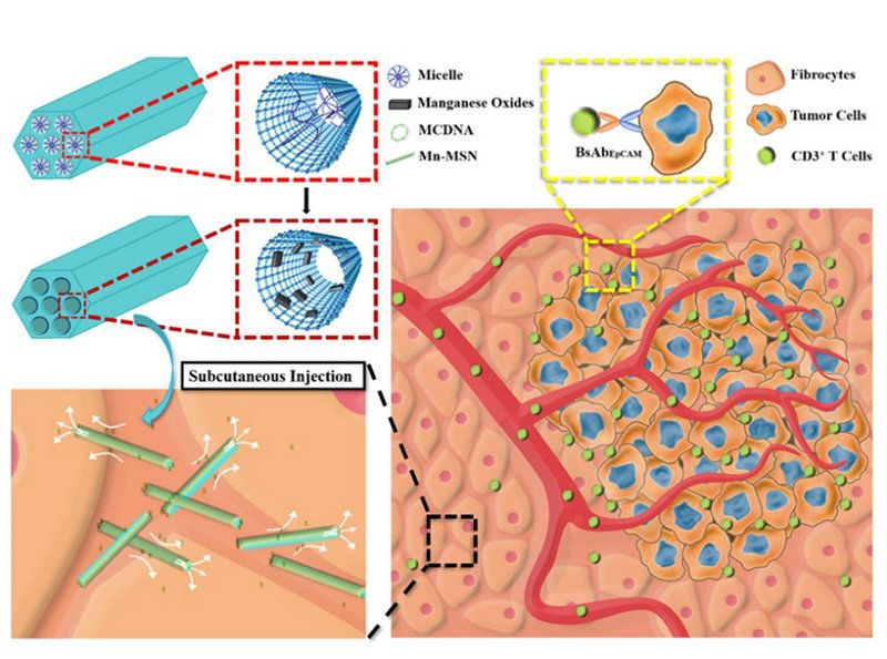 图1 一种基于纳米棒的新型免疫调节纳米平台。在磁共振成像引导下,高纵横比纳米棒和细胞间存在界面刺激作用,协助双特异性靶向抗体编码微环DNA的体内递送