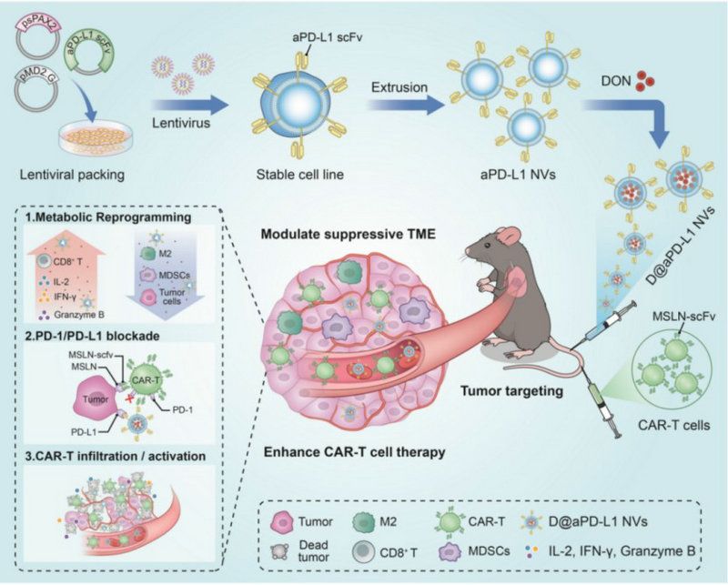 该研究开发了一种能增强CAR-T细胞治疗实体瘤功效的潜在药物——多功能基因重编程细胞囊泡(D@aPD-L1 NVs),该药物通过负载谷氨酰胺拮抗剂以改善抑制性的肿瘤微环境达到增强CAR-T细胞在肺癌中的治疗效果,具有良好的临床转化潜力和应用前景,对进一步的临床应用具有重要的指导和借鉴意义,为肺癌领域的治疗提供了一种新的策略选择手段。该成果已申请相关专利。