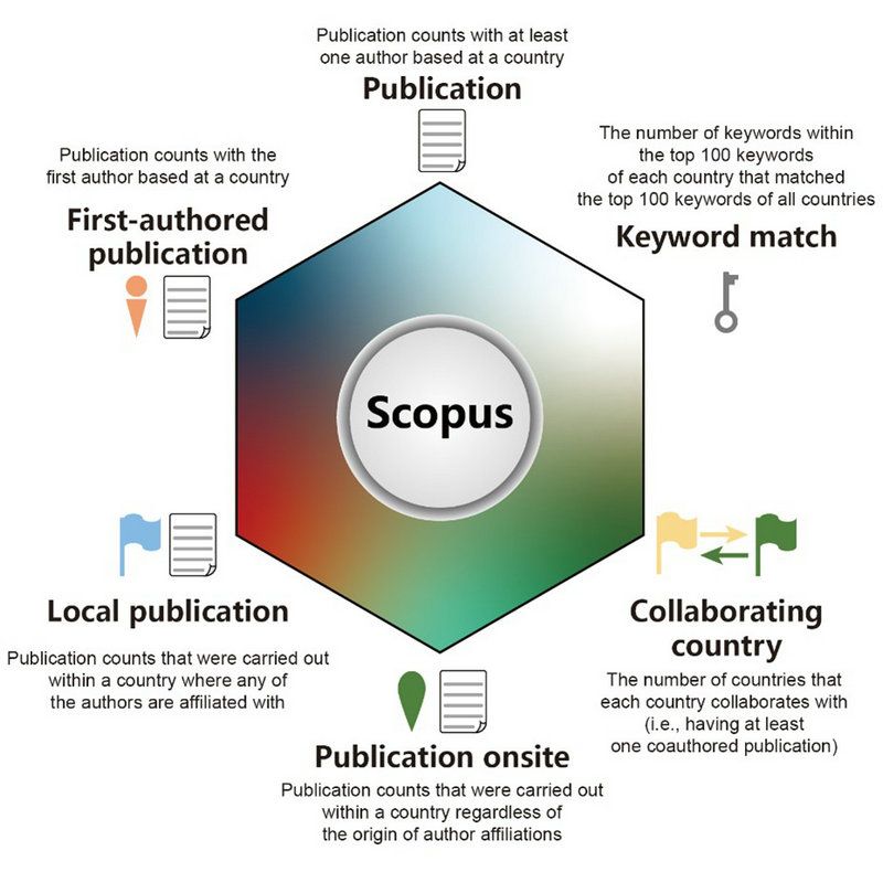 图1 基于大规模文献检索构建的国家保护研究能力指数,包括文章总数、一作文章数、本国研究数(本国科学家参与的在本国开展的研究数)、本地研究数(在本国开展的研究数)、合作国家数,和关键词匹配率。