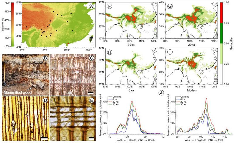 图:A, 华山松现代分布(黑点)和化石产地(五角星);B, 化石产地地层剖面及华山松木化石;C-E, 华山松木化石解剖结构;F-I, 模拟显示3万年以来华山松的分布:F, 3万年前(30 ka)华山松的潜在分布区;G, 2万年前(20 ka)华山松的潜在分布区;H, 6千年前(6 ka)华山松的潜在分布区;I, 华山松现代分布区;J, 末次冰期以来华山松在不同经纬度上潜在分布区的变化。比例尺:C, 200 μm; D, 100 μm; E, 20 μm。