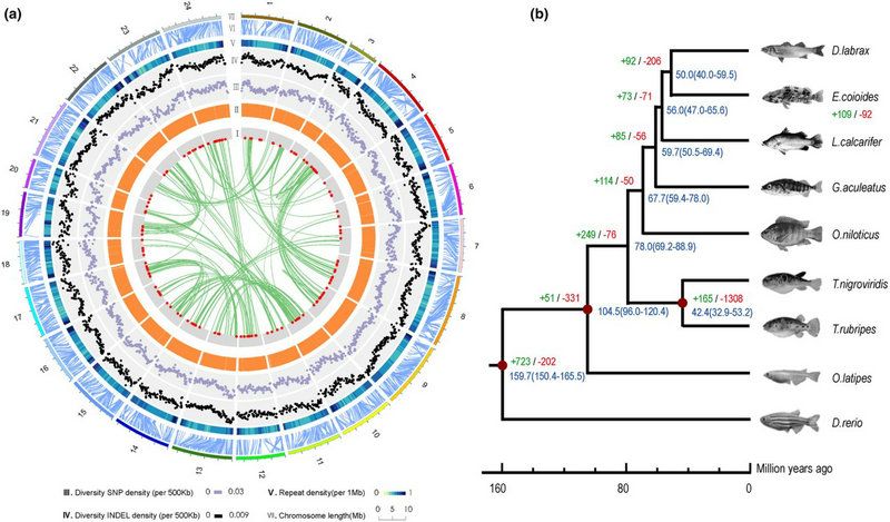 图1. 斜带石斑鱼染色体水平的基因组组装和系统进化分析。(a)染色体上的基因位置、基因、SNP、基因缺失和重复密度的分布情况;(b)斜带石斑鱼系统发育树。