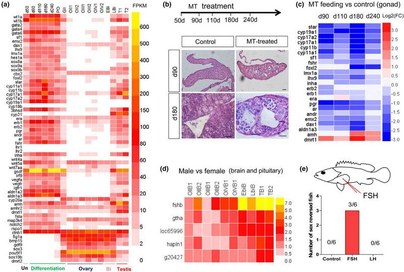 图2. 性别分化与性转换过程的转录组分析。(a)性别分化和性转换过程不同阶段性别相关基因的热图;(b)雄激素诱导石斑鱼性别转变;(c)雄激素诱导性转变后,性腺转录组差异表达基因的热图;(d)性别转换过程中脑和垂体转录组差异表达基因的热图;(e)FSH蛋白注射诱导石斑鱼雌转雄研究。