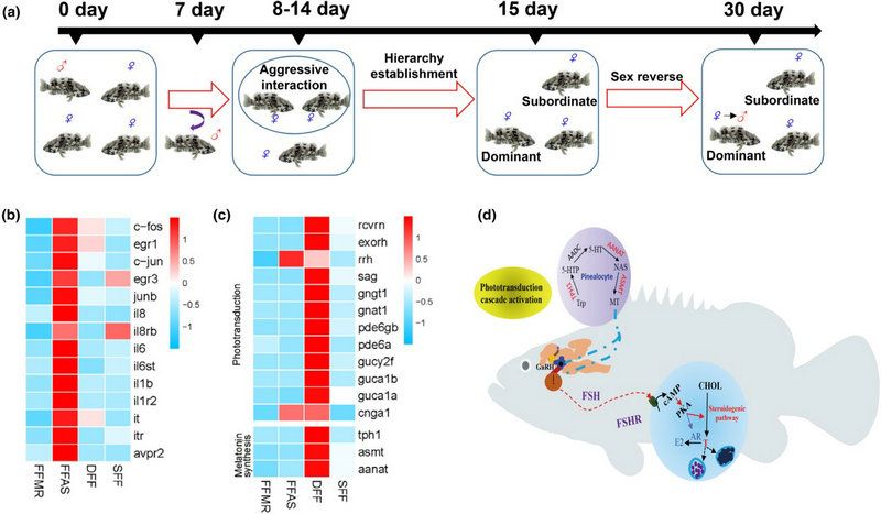 斜带石斑鱼的性转变与社群因素的变化相关:在繁殖季节,人工构建1雄3雌的社会群体,1个星期后,移走雄鱼,群体内的雌鱼通过打斗来确定社会地位,在1个月内占优势地位的雌鱼会发生性别转变。通过社群因素诱导斜带石斑鱼性别转变的转录组分析发现:在确定社会地位后,褪黑激素合同通路的关键酶和光传导通路的关键基因在占优势地位的雌鱼脑中高表达,提示褪黑激素合成和光传导通路的激活可能诱导雌鱼性别行为的转变,进而启动性腺的性别转变。