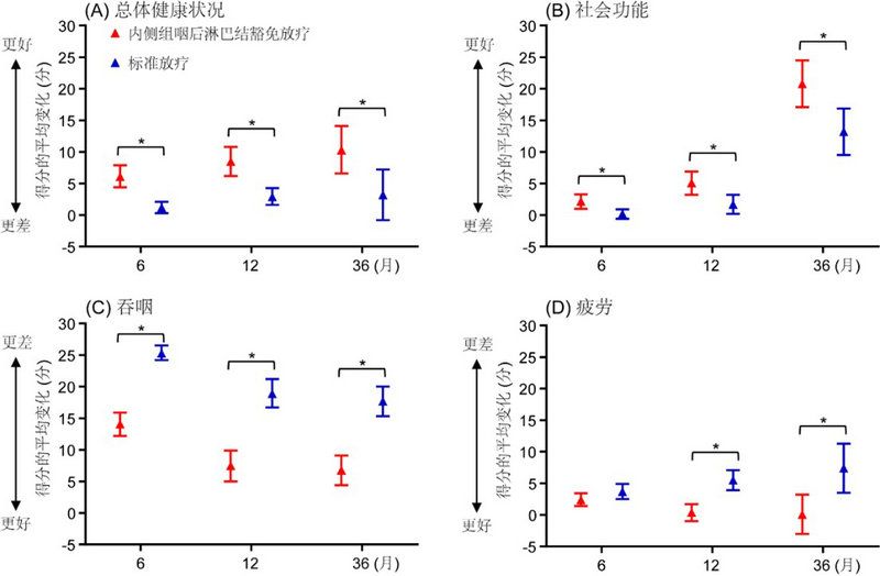 在毒副反应和生活质量方面,内侧组咽后淋巴结区豁免放疗组放疗相关毒副反应发生率更低,包括急性黏膜炎(内侧组咽后淋巴结豁免放疗组67.7%对标准放疗组79.8%)、急性吞咽困难(25.5%对35.1%)、体重下降(46.8%对57.8%)以及晚期吞咽困难(24.0%对34.3%)。另外,内侧组咽后淋巴结区豁免放疗组在健康状况、社会功能、是否容易疲劳及吞咽困难等方面的生活质量均明显优于标准放疗组。