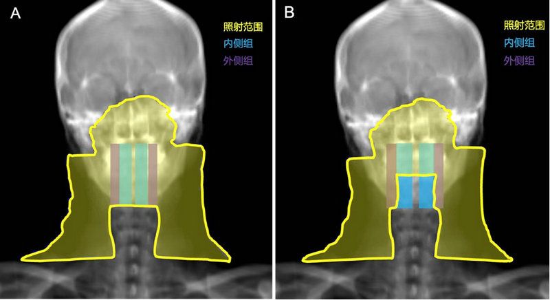 A对照组:内、外侧组咽后淋巴结区均接受预防照射(左)