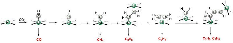 自然界的 [Ni-Fe]-氢化酶和一氧化碳脱氢酶能够进行高选择性的质子或二氧化碳还原,这两类酶的催化中心均涉及镍-硫配位结构。鉴于此,bat365在线中国登录入口化学学院韩治际教授课题报道了一系列同时具备此两类酶催化活性特性的镍巯基配合物(图1),首次实现分子催化剂上实现了二氧化碳还原为C3(丙烯和丙烷)等多碳产物,碳水化合物的总法拉第效率高达41.1%。