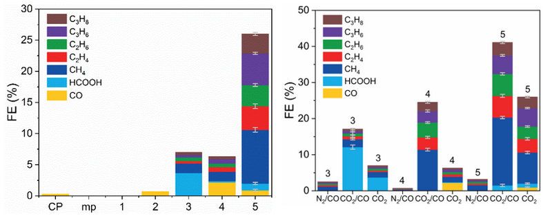 作者通过对比不同配原子的镍巯基配合物,筛选出系列中活性最高的配合物5。在可逆氢电极−1.0 V的条件下,配合物5的C1、C2、C3碳氢化合物的法拉第效率(FEs)分别为10.6%、7.2%和8.2%。结果表明,Ni−CO为反应中的重要中间体,系统在一氧化碳的条件下可以显著促进配合物的催化活性,其中C1、C2、C3烃的FEs分别提高至18.8%、12.1%和8.7%。研究通过各类光谱,如:NMR、CV、UV-vis、ESI-MS、XPS、DLS、SEM和HR-TEM等,对催化过程中催化剂的变化进行了详细的研究,充分证明了此类配合物的结构在CO2还原过程中保持完整。该工作为仿生催化剂的合成和CO2还原的机理研究均提供了新的研究思路。