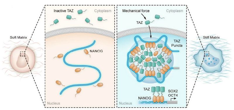 图1:研究发现肿瘤干细胞生态位硬度增加时,生物机械力转导分子TAZ被微环境机械力激活进入胞核,进而与干细胞转录因子NANOG的N端结构域发生液-相分离,促使NANOG结合到干性相关基因SOX2和OCT4的启动子区域,促进SOX2和OCT4转录,维持肿瘤干细胞相关特性。揭示了生物机械力参与调节肿瘤微环境的新机制,提示肿瘤微环境中的生物机械力是治疗肿瘤耐药的潜在靶点。