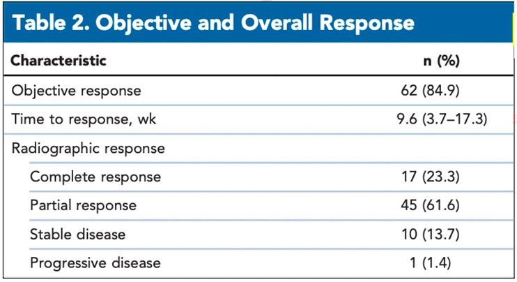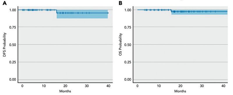 研究纳入了来自国内三家中心73名接受PD-1抗体新辅助免疫治疗的结直肠癌患者。结果显示,84.9%的患者获得客观缓解,其中23.3%为临床完全缓解采取观察等待策略。即便对于局部分期较晚的患者,客观缓解率也达到了84%。在接受手术的患者中,有近60%的患者获得病理完全缓解。平均随访了17.2个月后,中位无病生存期(DFS)和中位总生存期(OS)均未达到。在接受手术和达到完全缓解的患者中,2年肿瘤特异性无病生存率和总生存率均为100%。