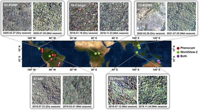 该研究在具有大降水梯度(1,470-2,819 毫米每年)的 16 个热带森林地点(图1)测试了该方法的有效性。在这些站点中分别使用超高分辨率卫星 WorldView-2(n=9 个站点)和地面物候相机 phenocams(n=9 个站点)对微小卫星(PlanetScope)获取的落叶度进行了精度评估。