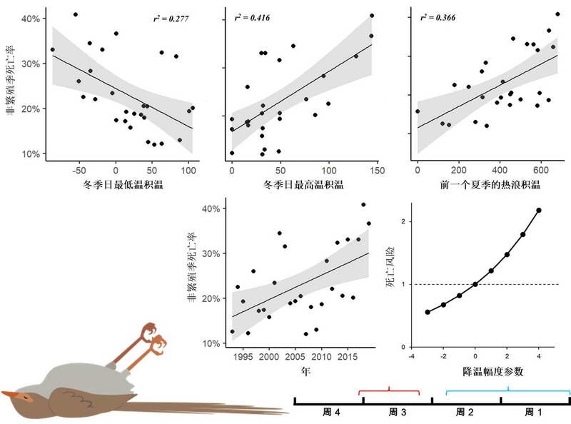 研究揭示了冬季的温度和前一个夏季的热浪对华丽细尾鹩莺非繁殖季死亡率升高的影响。华丽细尾鹩莺个体在经历一周暖温和两周低温这样较大幅度的降温会导致死亡风险增加。