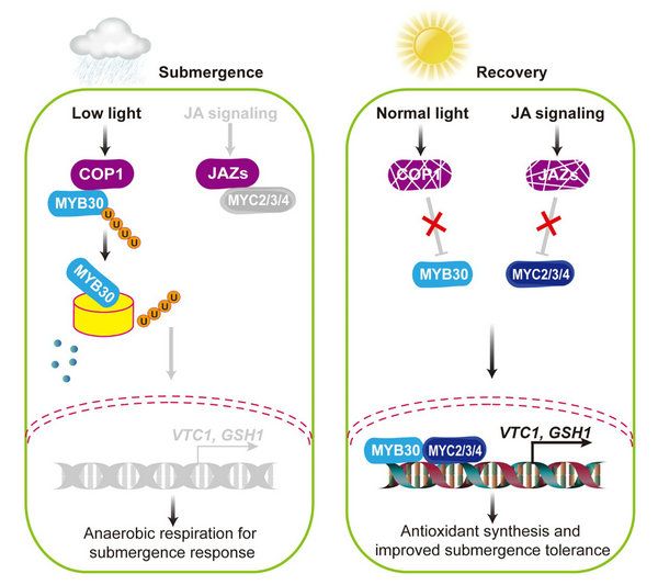 中大新闻网讯(通讯员肖仕)目前,洪涝灾害在全球范围内发生频率剧增,灾害范围逐年扩大,已成为最重要的农业灾害之一。植物长时间浸没于洪涝/淹水环境中会导致根际氧气含量显著减少,从而造成低氧胁迫 (hypoxia);长期的淹水胁迫也会使得植物所处环境中的光照强度大幅度下降,导致弱光胁迫。因此,低氧和弱光是影响植物淹水适应性的两大关键因素。有研究表明,植物在淹水后复氧反应 (reoxygenation response)中,光照变化是导致细胞中过氧化物积累、影响植物逆境耐受性的重要原因;然而到目前为止,光照如何调控植物淹水及淹水后复氧应答的作用机理还不清楚。