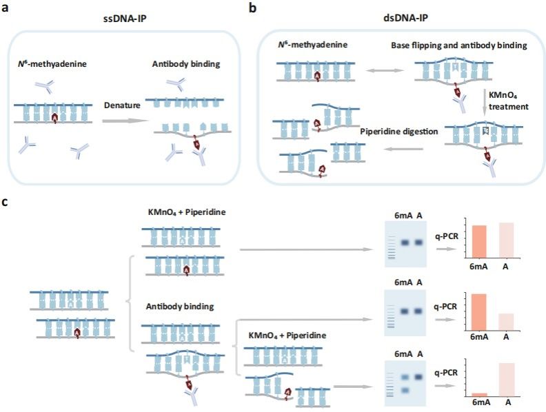 该研究中发现在双链DNA中,6mA特异性抗体可以识别嵌入在DNA双链上的修饰腺嘌呤。在研究了6mA的化学性质后,研究者推测6mA的存在减弱了碱基的堆积,并使局部DNA双链不稳定。研究者通过高锰酸钾足迹法证实了双链DNA上的N6 -脱氧腺苷促进了类似错配结构的产生,其机制可能是通过DNA呼吸或碱基翻转。这种独特的类错配结构允许6mA被6mA特异性抗体捕获,随后被特定的核酸酶或化学裂解反应识别。随后,根据这一原理开发了一种全新的6mA定位方法MM-seq (modified -induced Mismatch Sequencing)(图1)。