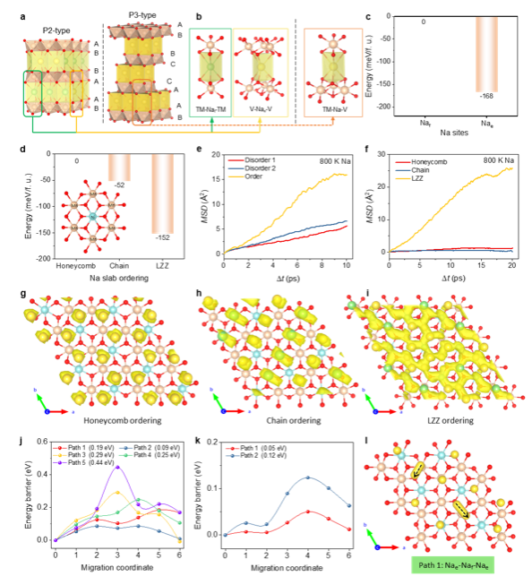 通过第一性原理计算,进一步阐释了P相层状氧化物中钠层中钠离子与空位形成有序无序结构的基础。如图2 所示,由于P2相材料中过渡金属层的堆垛方式与P3相不同造成其中钠离子存在高能位与低能位两种钠位点。有意思的是,当P2-Na2/3Ni1/3Mn2/3O2相材料中呈现实验观测的大的“锯齿型”排列的方式时,这种占据方式形成能更低,且分子动力学模拟中的钠离子概率密度图2i中钠离子扩散通道最通畅。此外,过渡态搜索的计算也揭示了,相比于无序占据,“锯齿型”排列中的钠离子更倾向于以协同输运的方式进行传输的,这也和van Hove关联分析结果相互印证。当这种有序打破或者降级成其他类型的有序占据,钠离子自扩散系数大大下降。