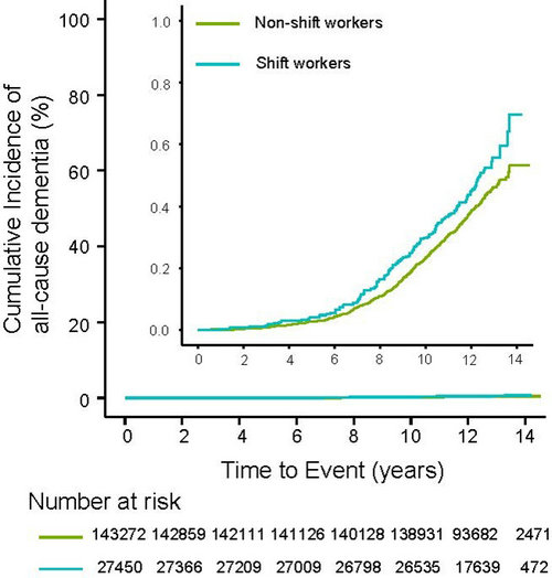 本研究为一项前瞻性队列研究,自2006年至2010年间招募社区人员,选择基线时处于工作状态,且无认知障碍或痴呆的研究对象纳入研究。根据基线时自我报告的工作倒班情况,分为非倒班工作组和倒班工作组。平均随访时间12.4年,主要结局是全因痴呆,次要结局是痴呆亚型包括阿尔茨海默病、血管性痴呆和其他类型的痴呆。结果表明,倒班工作与非倒班工作相比,全因痴呆的风险增加30%。倒班工作与痴呆遗传易感性之间在没有显著的交互作用。