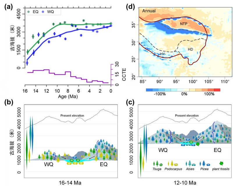 研究结果揭示,青藏高原东北部柴达木盆地东、西段山体在距今1500万年前的海拔分别为1332±189米和433±189米,随后东段山体在1100万年前迅速抬升到3685±87米,西段山体则在700万年前抬升至3589±62米,已接近现代高度(图2a);而盆地海拔在1600-1400万年前为1102±429米,并于1100万年前抬升至2355±703米 (图2b-c)。研究团队进一步利用高分辨率区域气候模式RegCM 4.6定量评估了高原东北部隆升对高原自身及周边地区气候的影响,发现如果高原东北部降低到现在海拔的1/3,该区域年降水量则减少50%以上,而高原南部喜马拉雅山脉和东南部的横断山区,降水量则分别增加50%和150% (图2d),这主要是山脉雨影效应增强和区域环流变化共同影响所致。这一认识与柴达木盆地西部耐旱植物孢粉含量增加以及粗骨鱼出现指示的气候变干相吻合;而在喜马拉雅山和横断山区,由于降水量的显著增加和高地形的存在支撑了该区域丰富的生物多样性。这项研究表明青藏高原东北部隆升产生的气候效应显著影响了青藏高原地区的气候和生物演化。