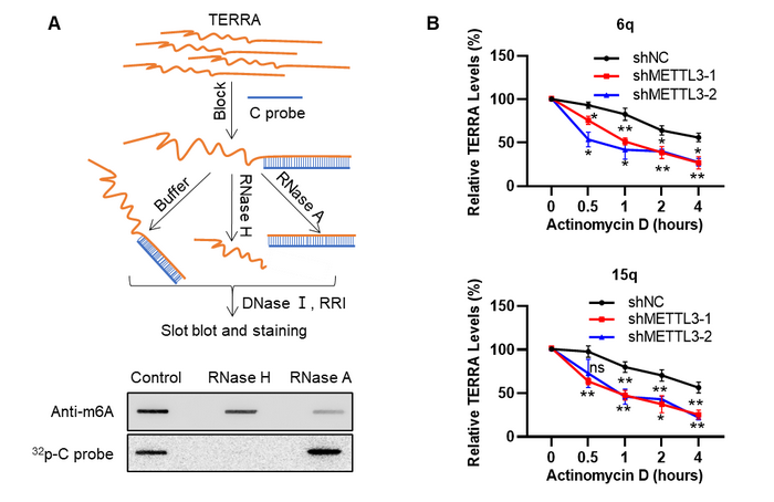 图1 TERRA的亚端粒序列具有m6A修饰(A),敲低METTL3 TERRA加速TERRA降解(B)