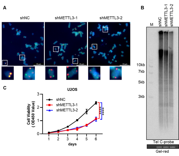 由于ALT细胞的端粒同源重组依赖于TERRA,METTL3的敲低使得TERRA及端粒R-loop减少,同源重组效率下降,进而使得端粒缩短,最终显著抑制ALT肿瘤细胞的增殖,而对端粒酶阳性肿瘤细胞无抑制效果。这些结果表明TERRA的稳定性受m6A修饰调控,通过抑制METTL3降低TERRA水平引起端粒不稳定是潜在的ALT肿瘤治疗新途径。