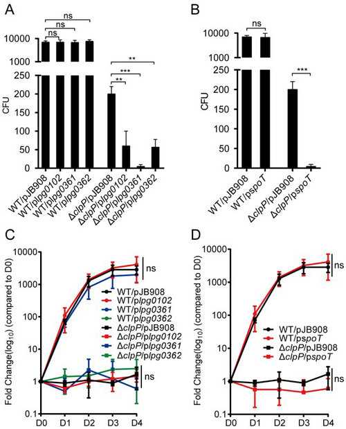 作者对军团菌双相生活周期中受控蛋白和底物蛋白的ClpP依赖性动态谱进行了表征,发现ClpP是生活周期依赖性蛋白表达的主要调控因子,并进一步发现嗜肺军团菌需要依赖ClpP的蛋白水解来监测脂肪酸生物合成相关蛋白Lpg0102/Lpg0361/Lpg0362和SpoT的丰度,以正常调节自身的分化。该研究首次明确了SpoT蛋白是该菌完整生活周期的复杂调控网络中最关键的调控因子。