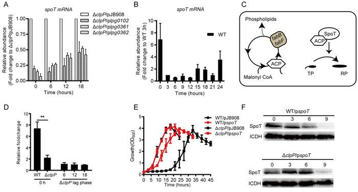 图4 ClpP通过脂肪酸生物合成蛋白调控SpoT水平以生活周期的转换