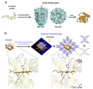 在细胞内,蛋白质结构的精准折叠通常需要依赖分子伴侣的功能。分子伴侣是一种具有笼状结构的蛋白质多聚体,笼状空腔可封装错误折叠或非折叠的蛋白质,并在ATP作用下介导蛋白质折叠成正确的结构(图1a)。受启发于此,近年来科学家致力于设计人工多孔材料,通过类似的封装作用调控蛋白质构象。尽管金属有机框架、共价有机框架等多孔材料在蛋白质封装方面取得了系列的进展,但目前仍未有有效策略来调控蛋白质的构象,并赋予蛋白质非天然的本征活性。