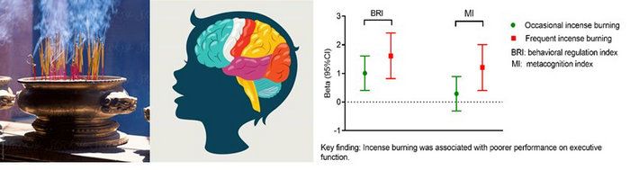 中大新闻网讯(通讯员桂曌环)“烧香”的历史由来已久,在亚洲和阿拉伯湾地区非常普遍,是当地居民祭祖、拜佛、净化空气或释放香气而经常采取的方式。调查显示,广州1/4的家庭有“烧香”习惯;台湾和新加坡,因道教和佛教的兴盛,“烧香”习俗更为普遍,约1/3至一半的家庭会在家里烧香。一根香燃烧时间大约1~1.5小时,期间可释放多种空气污染物,包括颗粒物,气体污染物,多环芳香烃和挥发性有机化合物等,其中多环芳香烃属于一类致癌物。研究发现,燃烧1克佛香产生的颗粒物可高达45 mg,远多于香烟燃烧产生的颗粒物(10 mg)。已有研究表明“烧香”和人群心血管疾病、肺癌以及孕期高血压等存在关联。儿童时期是大脑快速发育的关键时期,在此期间接触不良环境因素可能会造成即刻或将来的健康危害。家中“烧香”是否也会影响儿童认知功能?相关研究较少且结论尚不明确。