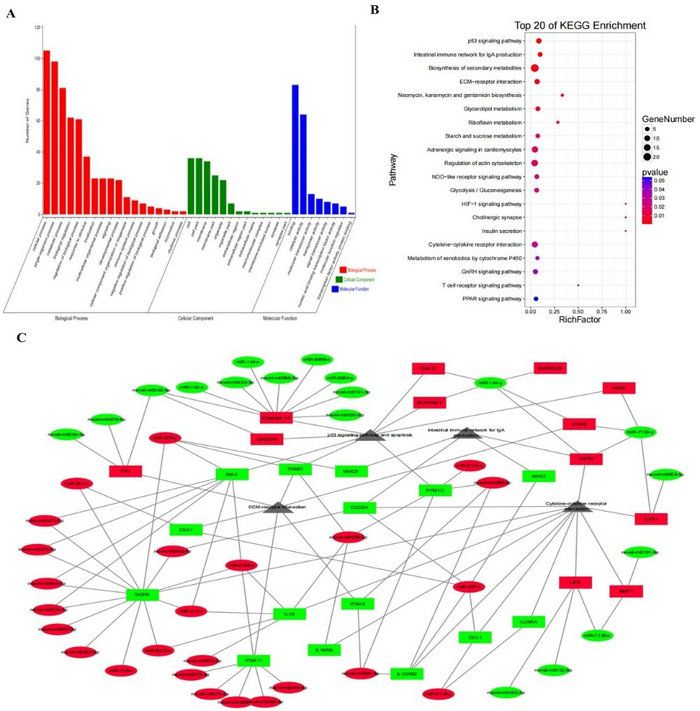 图2 差异表达miRNA靶基因的功能注释分析和miRNA-mRNA-pathway互作网络