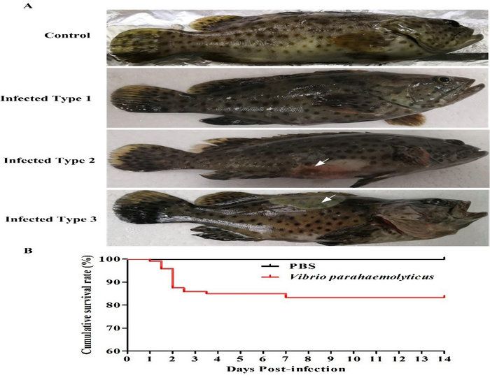图1 副溶血性弧菌感染后斜带石斑鱼的症状和累积存活率