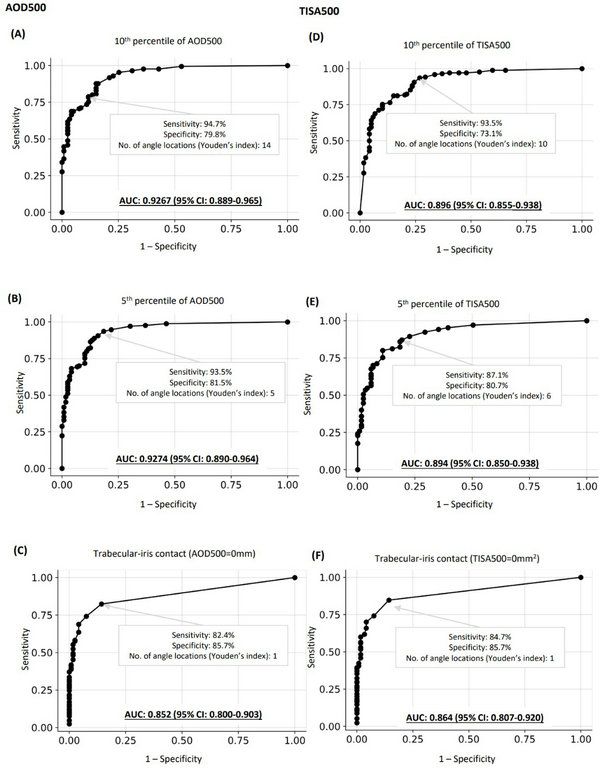 研究结果显示AOD500或TISA500比ITC500具有更高的PACD诊断效能(诊断开角或闭角),前者的AUC比后者平均高0.04-0.06(AUC:0.895-0.922 vs. 0.852-0.864,图1)。