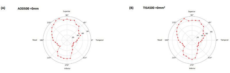 研究分为两个部分。第一部分共纳入394个正常眼以得出PACD诊断的阈值,即房角开放距离AOD500/小梁网虹膜空间面积TISA500的第5或第10百分位,并验证以上阈值及ITC范围大小对PACD的诊断效能。第二部分共纳入119名对照和170名PACD患者(94名PACS患者,76名PAC/PACG患者),以探索ITC500(定义为AOD500 = 0mm或TISA500 = 0mm2)范围大小与PAC/PACG之间的关系。每个受试者随机选取一只眼睛进行前节OCT成像。