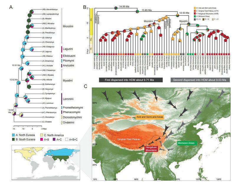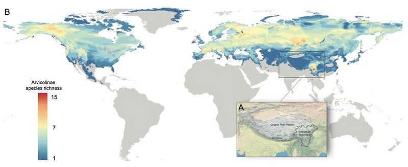 䶄亚科(啮齿目:仓鼠科)是一类高度多样化、年轻、快速进化的小型哺乳动物,主要包括田鼠,林鼠和麝鼠,广泛分布于北半球。值得一提的是,横断山区拥有世界上最丰富的䶄亚科田鼠物种多样性,是田鼠物种多样性的一个“热点区域”。与中亚山区和北落基山脉田鼠物种的连续分布模式不同,横断山区域的田鼠物种多样性呈现出明显的孤岛模式,横断山脉的邻近区域,如青藏高原、喜马拉雅山脉和横断山脉的东部区域,均呈现出极低的田鼠物种多样性。(图1)。