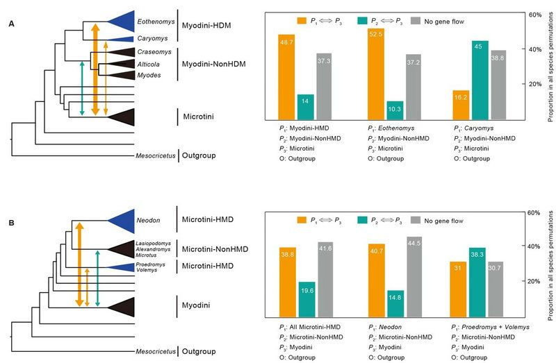 为了研究横断山脉田鼠的进化历史及其物种多样性形成机制,bat365在线中国登录入口生命科学学院张鹏教授与四川省林业科学院刘少英研究员团队合作,采集了四川西部、横断山脉和青藏高原的115个田鼠样本并进行了全外显子杂交捕获测序。研究通过对6517个蛋白编码基因的分析后发现,所有分布于横断山系的田鼠物种可以分为西方谱系 (包括Volemys, Proedromys和Neodon属) 和东方谱系 (包括Caryomys和Eothenomys属),这两个谱系均起源于约900万年前,从北欧亚大陆通过两次独立的迁移事件进入到横断山脉(图2);田鼠进入横断山脉后逐渐由低海拔向高海拔环境迁移适应,就地成种速率是迁移成种速率的2-3倍。在中新世800-250万年期间,两个田鼠谱系都经历了显著的物种多样性加速,通过就地成种模式进行快速的物种分化,该时间段与横断山脉的造山运动、季风形成促进的食物增加的时间一致(图3),表明气候与地质等环境因素在推动田鼠物种的形成中发挥了重要作用。此外,通过基因流分析研究还发现,横断山脉田鼠之间存在强烈的族间基因流动,族间基因流动产生的古代遗传变异的混合比一般情况下产生的遗传变异多样性要高的多,这些频繁的基因流动可能促进了横断山脉田鼠对高海拔环境的适应与物种形成(图4),遗传混合等生物因素对横断山田鼠物种的快速形成也有较大的贡献。