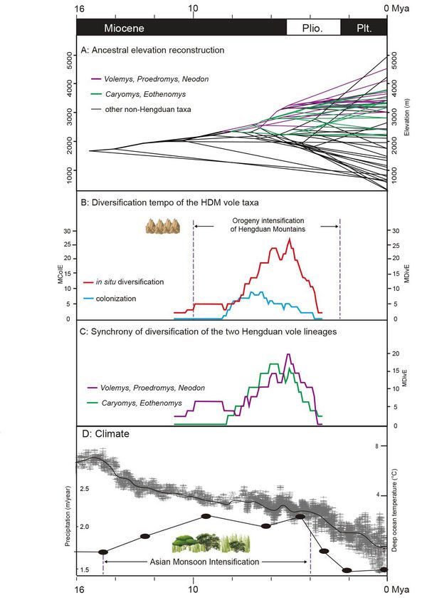 图3 横断山区田鼠在进化过程中不断向高海拔区域适应,其物种快速产生的时间段与横断山造山运动与季风活动的活跃期一致。