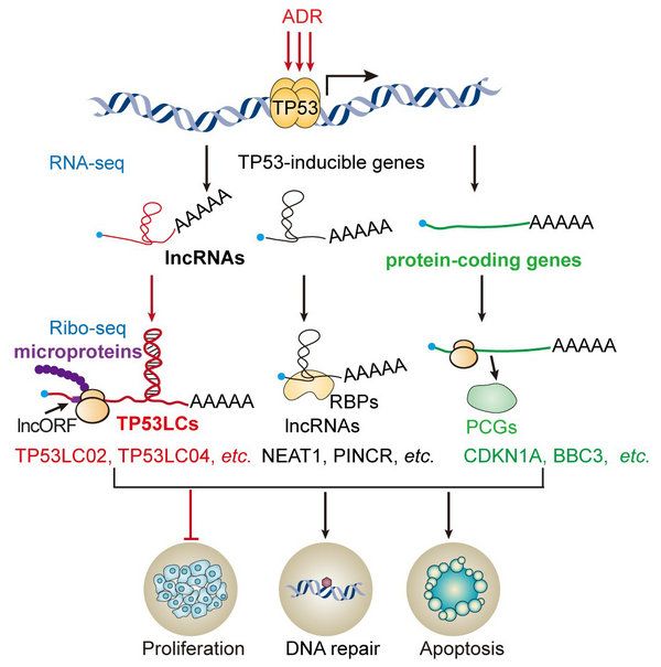近日,bat365在线中国登录入口生命科学学院杨建华教授/屈良鹄教授课题组利用多组学技术发现一批长链非编码RNA(lncRNA)编码的多肽是p53信号通路中的新成员,并揭示这些多肽在p53信号通路的功能与调控网络。团队通过构建DNA损伤修复细胞模型并结合核糖体图谱测序技术(Ribo-seq)、RNA-seq、CRISPR/Cas9技术及RNA组学分析技术(图1),在人类细胞中系统地鉴定到了300多个受p53调控的lncRNA和200多个具有编码潜能的lncRNA。