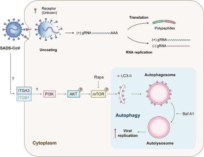中大新闻网讯(通讯员曹永长)猪急性腹泻综合征冠状病毒(SADS-CoV)是一种近年来新发现的蝙蝠源冠状病毒,可导致仔猪严重腹泻、脱水和死亡。2017年,SADS-CoV由曹永长教授团队在全球范围内首次分离并报道,随后该病毒从广东省蔓延到邻近的福建和江西等省份,对养猪业造成了很大的经济损失。细胞自噬是真核生物通过溶酶体降解自身组分以达到维持细胞内正常生理活动及稳态的一种细胞代谢过程,在调控生命稳态和细胞生长发育中起到了重要作用。之前有报道证明,细胞自噬在新冠病毒(SARS-CoV-2)的增殖中起到了重要作用,但其是否能够调控SADS-CoV在宿主的复制,目前尚不清楚。