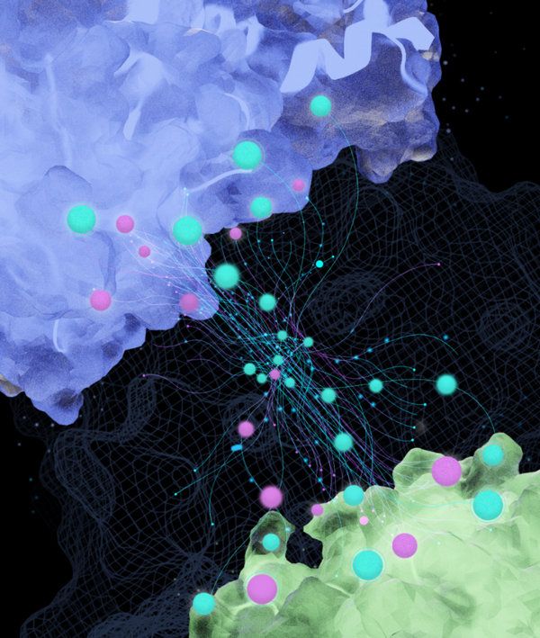 PROTAC设计过程示意图。圆圈和线条分别代表配体和连接子,象征着智能模型从广阔的化学空间中提取信息生成一个连接基团将两个蛋白质拉近的过程。