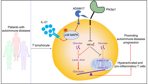 本研究提出并证实了新的T细胞负调控分子Pik3ip1通过代谢重编程作用于炎性环路,Pik3ip1/Hif1α/糖酵解轴是自身免疫性疾病的潜在治疗靶标。